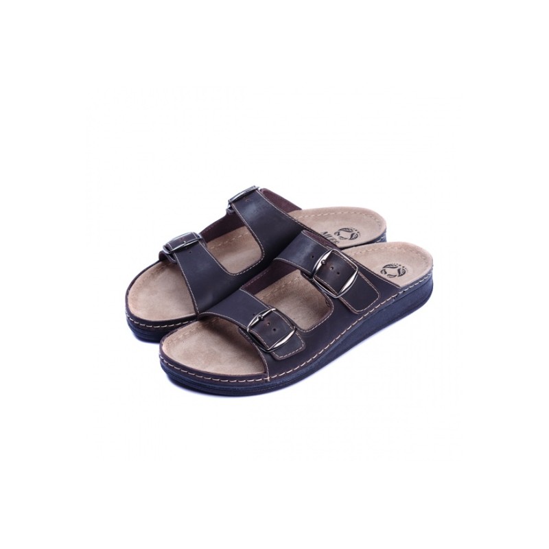 Верх взуття виконаний з натуральної шкіри. Головною особливістю є анатомічна підошва із поглибленням ложа стопи. Ортопедична устілка підтримує склепіння стопи і має високі амортизаційні властивості. Клейово-прошивний метод робить взуття більш міцним, а підошва з поліуретану має протиковзний ефект. Ремінцями можна відрегулювати ширину посадки.
