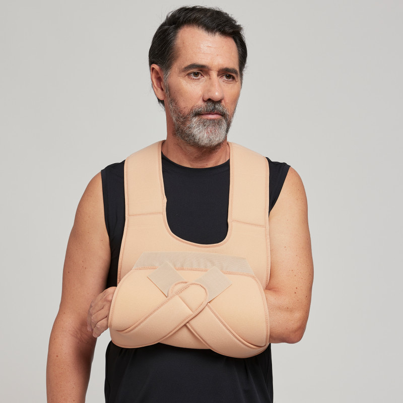 Ортез виконаний з багатошарового повітропроникного матеріалу. Матеріал досить тонкий, що забезпечує додатковий комфорт у використанні. Є широкою частиною для підтримки передпліччя з 2 ременів, які перехрещуються на спині, і широкої фіксуючої стрічки для фіксації плеча до тулуба шириною 15 см. Застібки Micro-Velcro значно полегшують використання ортезу. Легко знімається-одягається.